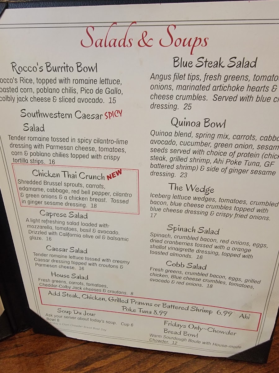 Rocco's offers a diverse menu that highlights fresh, quality ingredients with a creative twist. Start your culinary journey with their famous Rocco's Burrito Bowl, a mouthwatering medley of flavors for just $15. For those who enjoy a bit of spice, the Southwestern Caesar Spicy Salad is a magnificent choice at $16, dressed to tantalize your taste buds. Perhaps you’re in the mood for something hearty? Don't miss the Blue Steak Salad, lavishly topped with generous chunks of tender steak for $25—a dish that embodies meaty goodness and fresh greens.